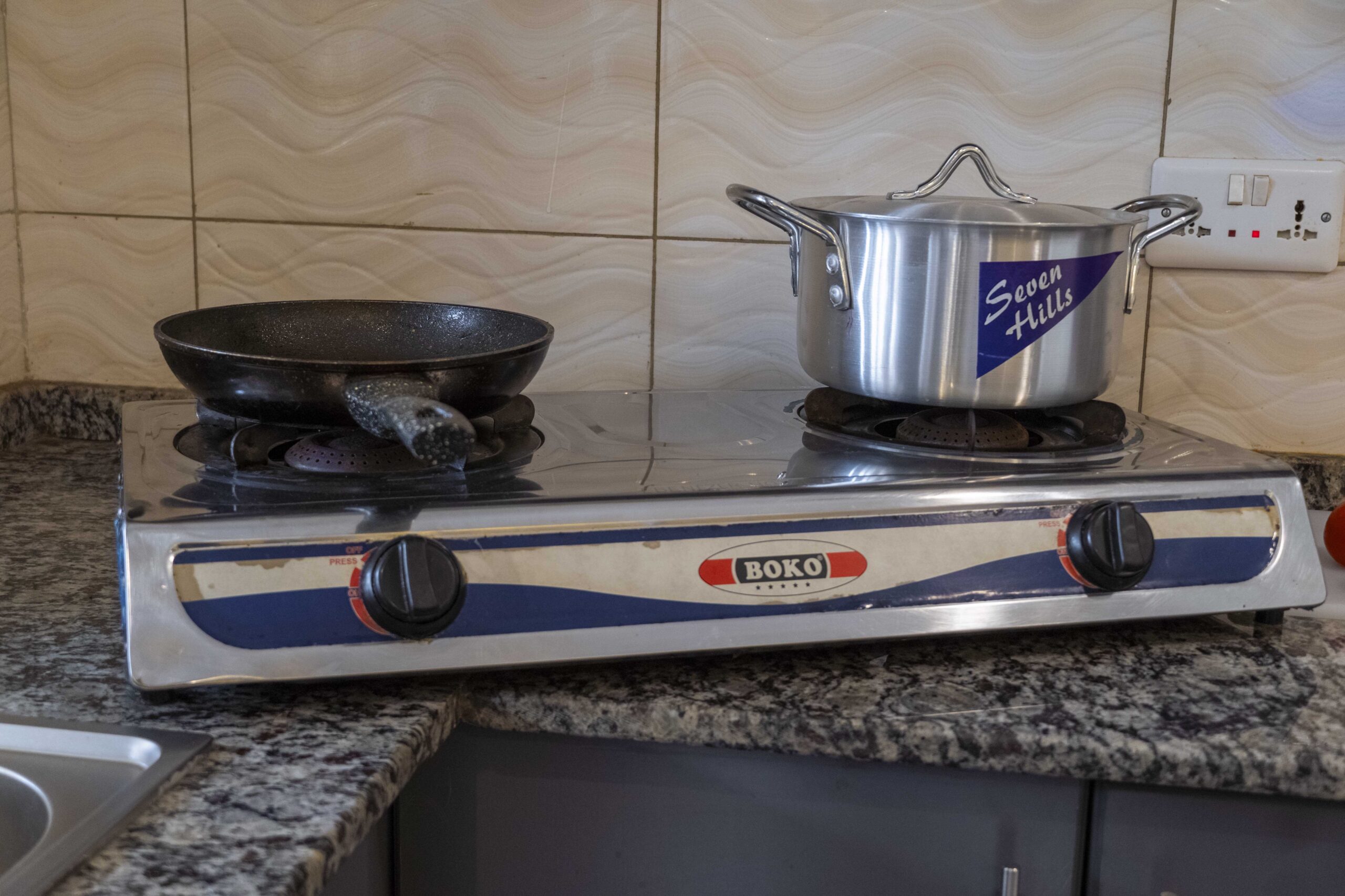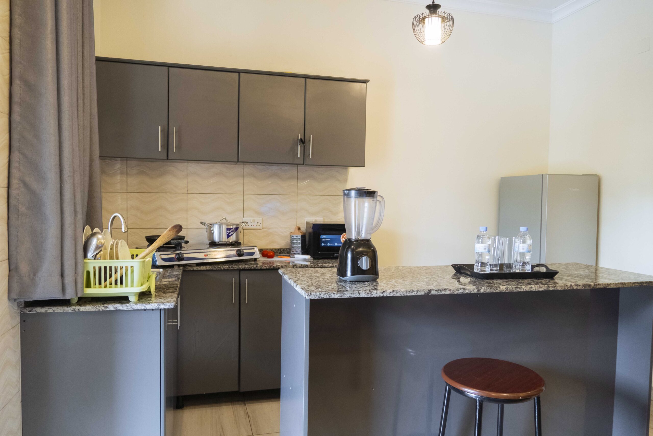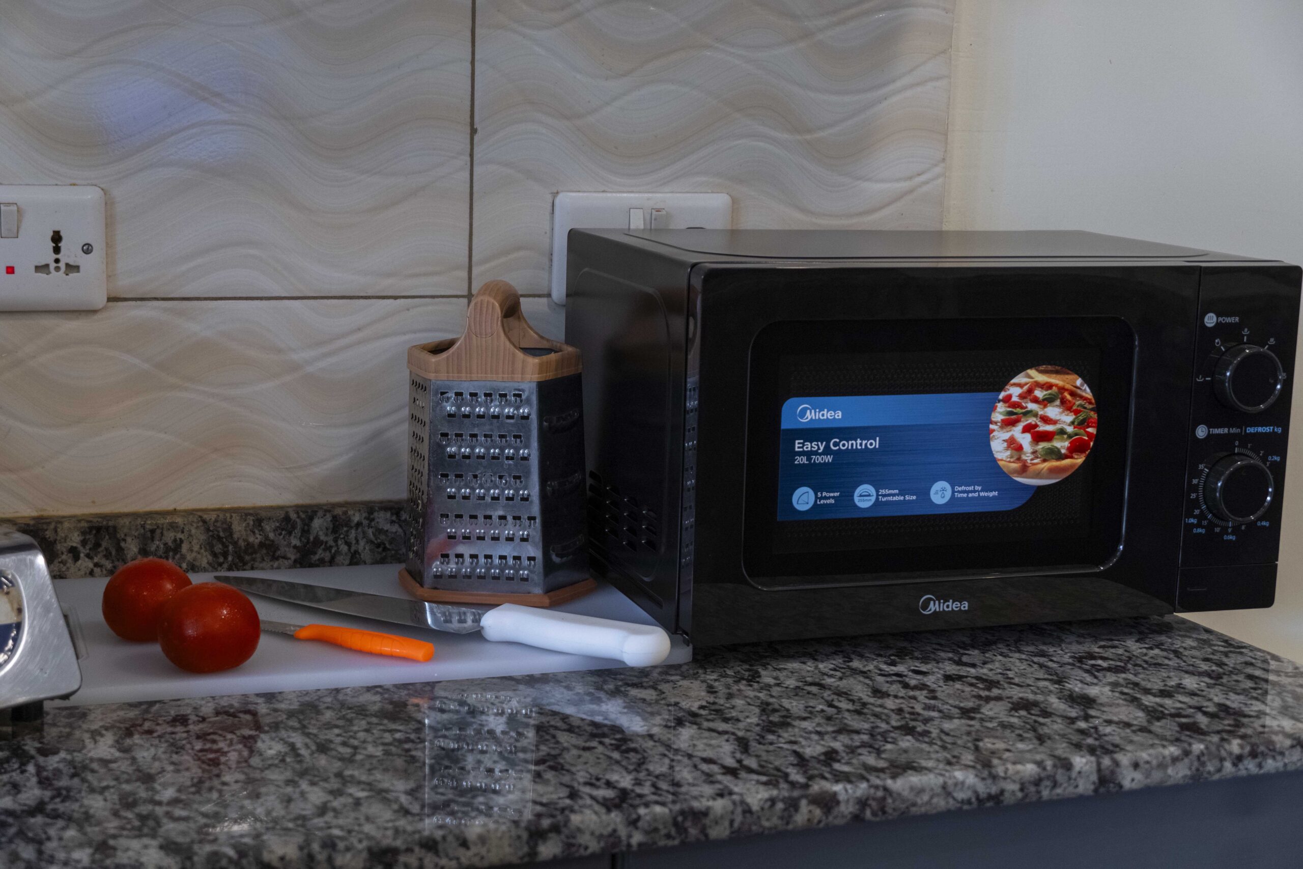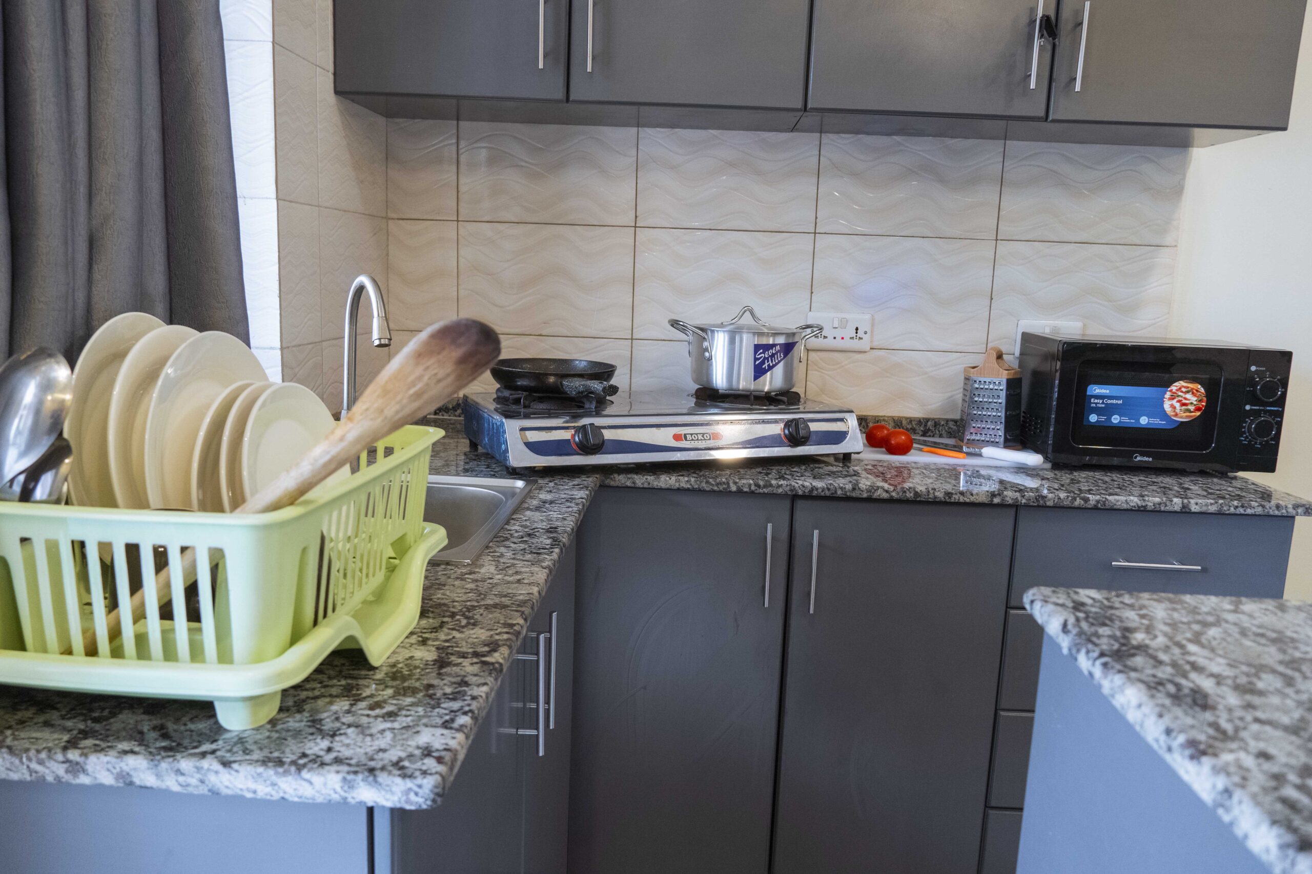 Enjoy home-cooked meals in the well-equipped kitchen, featuring a microwave, stove, kettle, refrigerator, and cooking utensils.