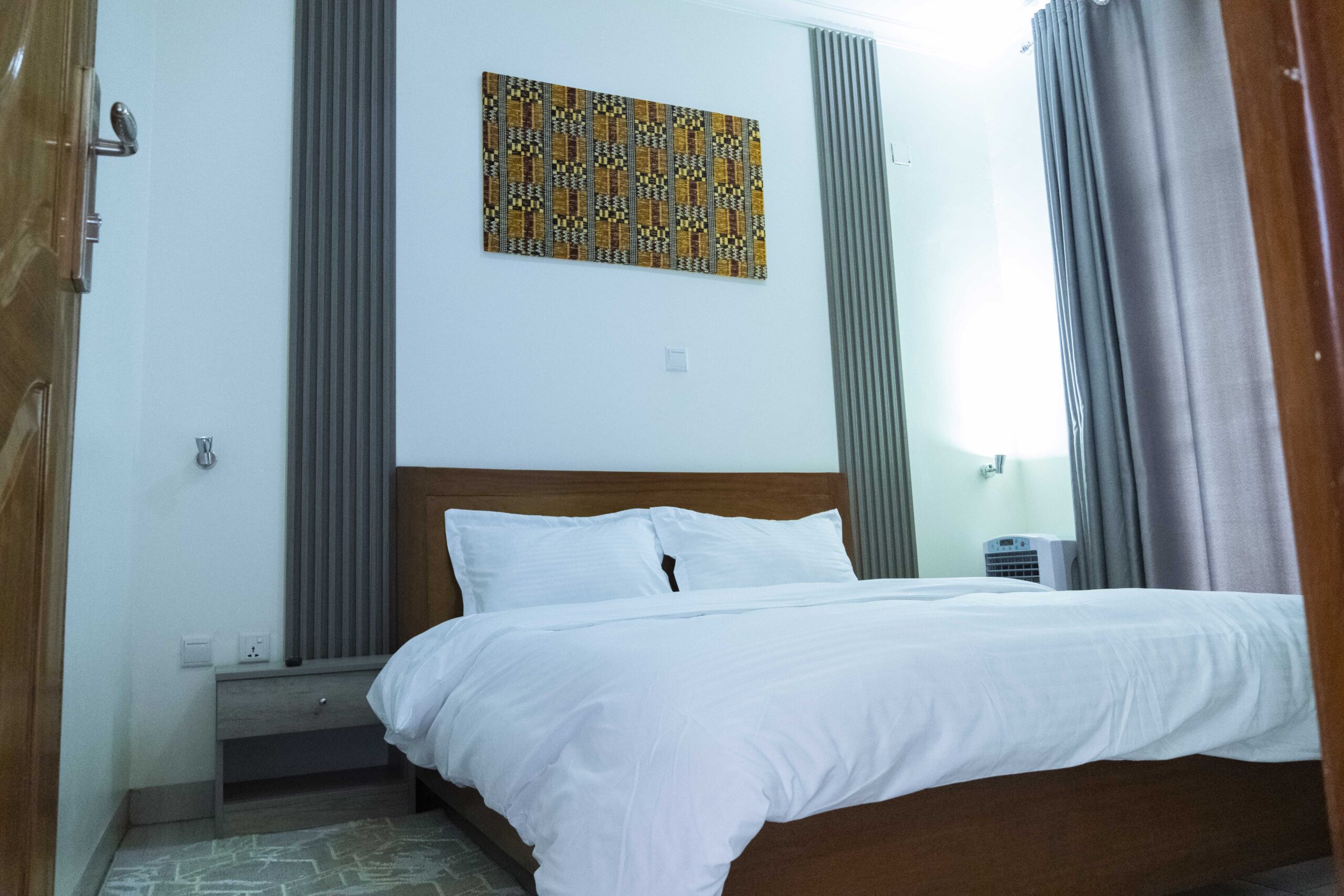 A warm, spacious bedroom featuring a queen-size bed (or twin beds on request), premium linen, and soft lighting for a relaxing stay.
