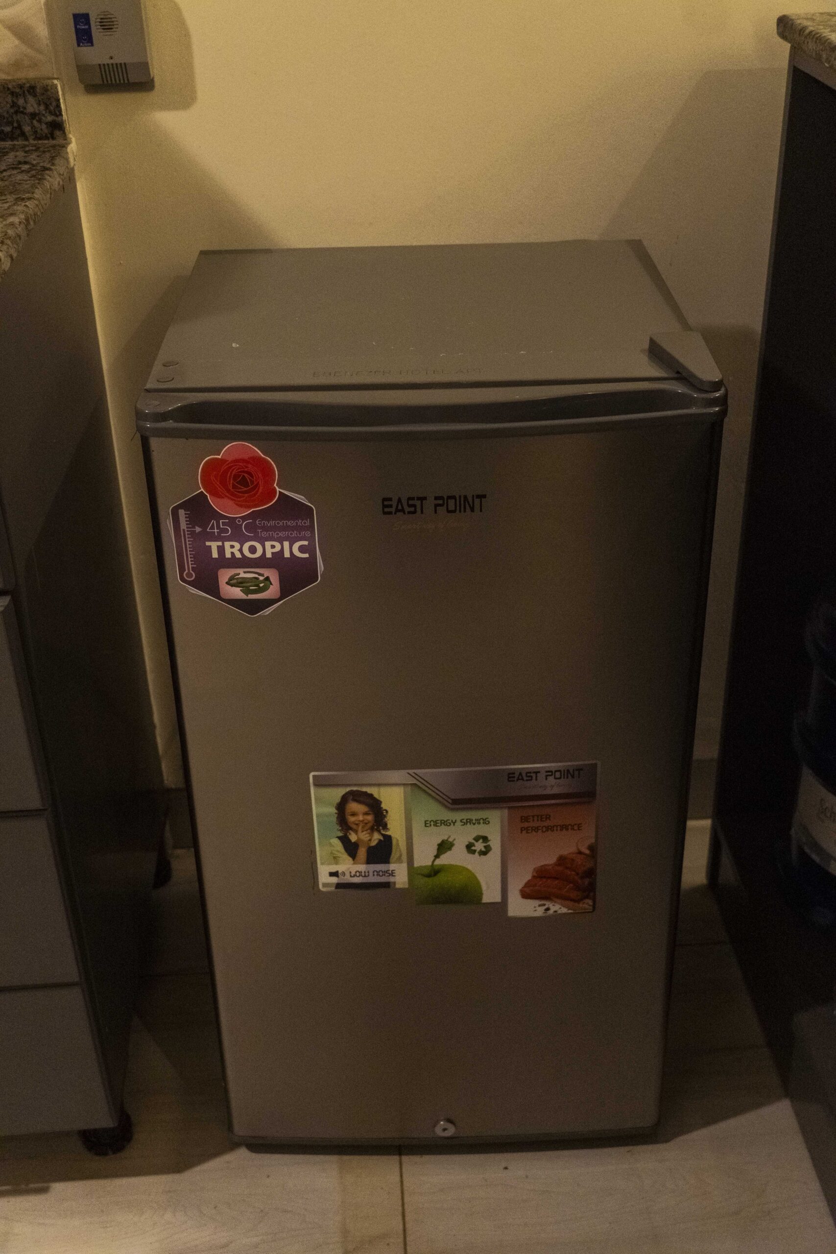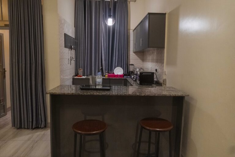 Whether you’re preparing a light snack or a full meal, this kitchen offers all the tools you need—stove, fridge, and cookware.